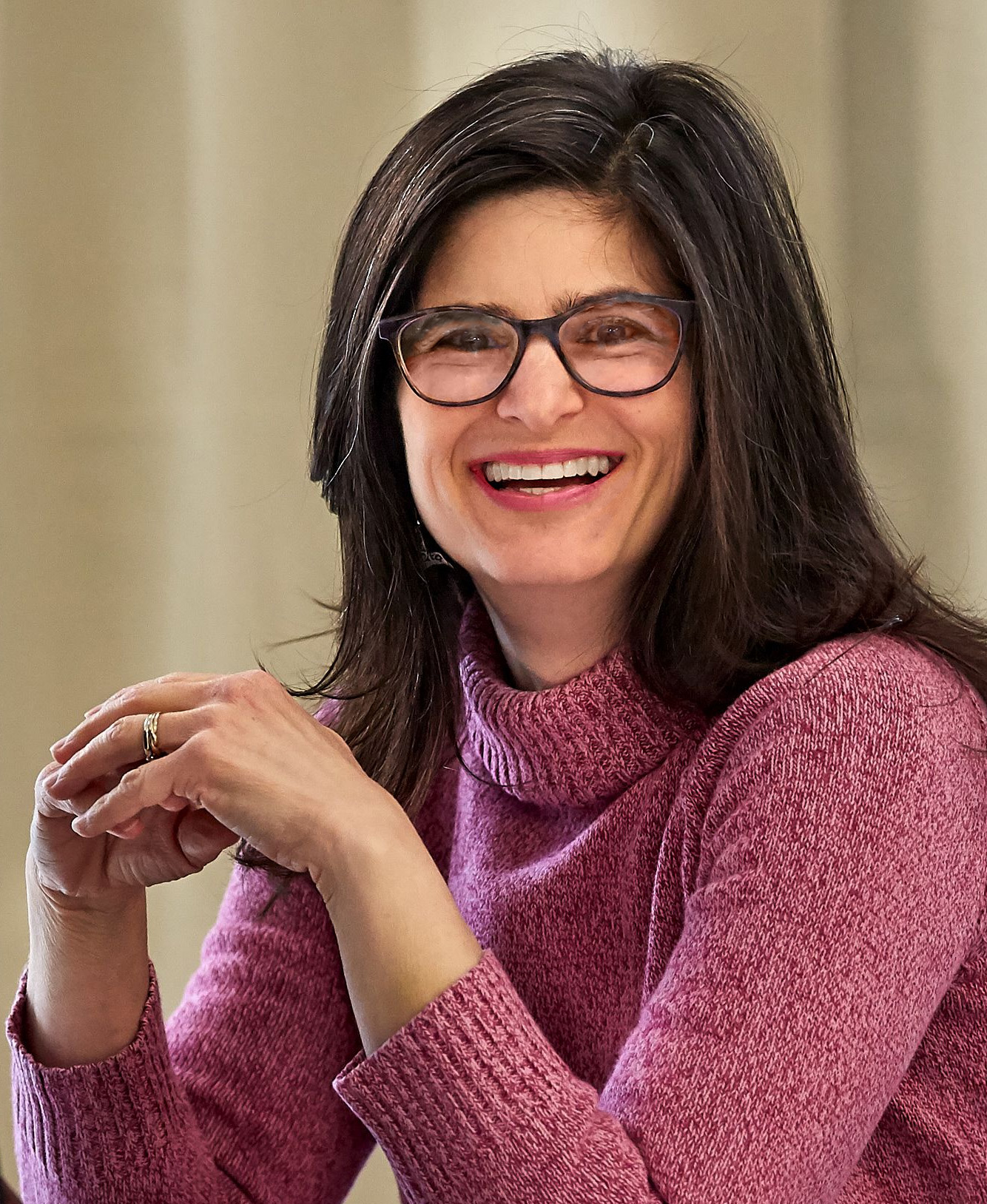 There are pluses and minuses for each image. Certainly, both are suffering from reflections in her glasses. The computer monitor is also pulling too much focus in both images because it is brighter. Any chance she would try poses without her glasses?