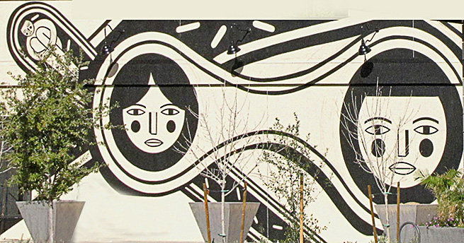 I'm thinking that your real subject is the mural in the surroundings it lives within. To that end, I have cropped out the area above it completely, stretched the left end to square it off, and cleaned up some of minor distracting elements in front of it. Thoughts? |