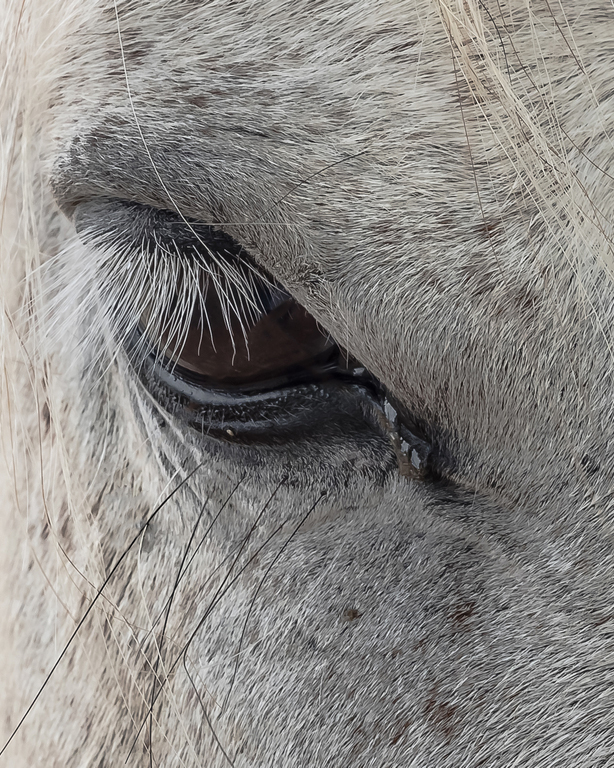 While I can see that the fly is a point of interest, I feel like it fights with the horse's eye for focus, and I would rather study a horse's eye than a fly any day. I also agree about the hairs that are covering the eye.