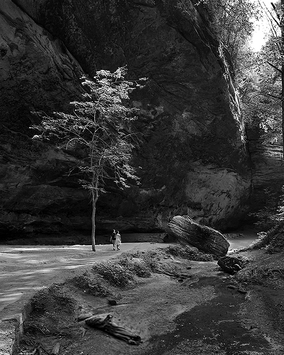 I cropped some from the bottom and right to put the horizon on the bottom third line and the small tree on the left third line. I also removed the people underneath the overhang and a few stick and stones in the water to have less distractions. Finally, I used a liquify on the log to give it a little more presence as a foreground element. Thoughts? |