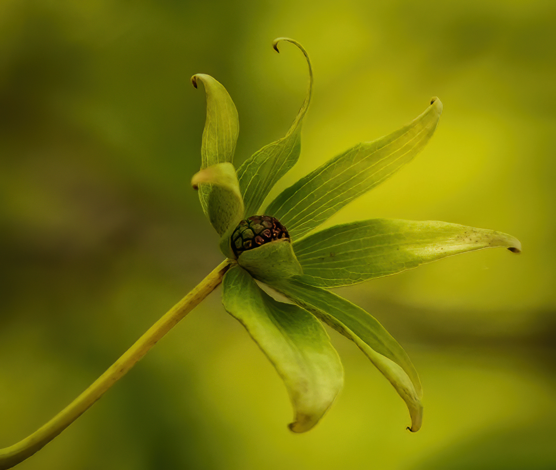 Lovely image! Really like the leading line of the stem on the diagonal and the dreamy green and brown background.