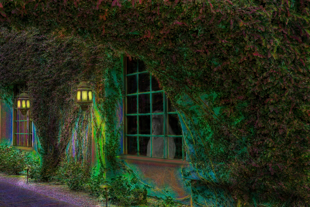 This is eerie, indeed! I almost expect a ghostly person to be peering out the window. I kinda agree with Dan about the amount of ivy-covered wall that dominates the right of the image, but I also think it gives some dimension to the image.