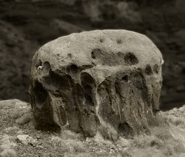 Here's my take: I rotated it slightly to straighten it, converted to monochrome with a sepia tint (as Dan suggested), then selected the background and applied some Gaussian blur and darkened it a bit so that the rock stood out more. Then I applied selective dodging and burning to give the rock more depth. I realize this was not your vision for this image, but I think it brings the viewer into closer contact with this amazing find. Thoughts? |