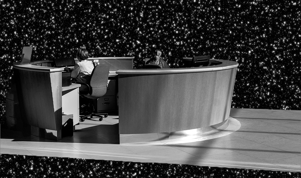 This has an other-worldly feel to it - the desk is so isolated and disconnected from everything, as if they were on a precipice.