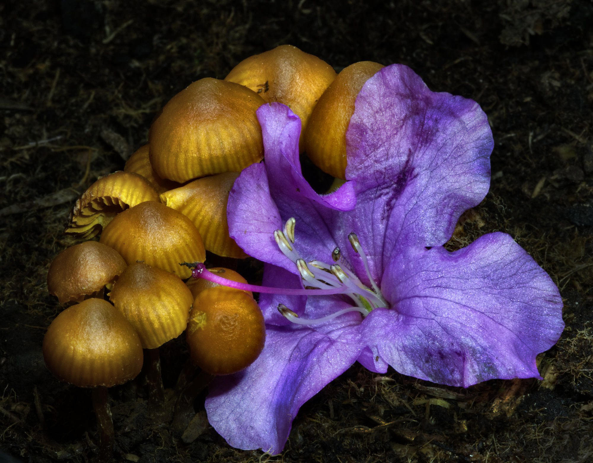 Cool composition, Stuart. The flower really spices up the image, which would probably have been cool enough with just the tiny fungi.