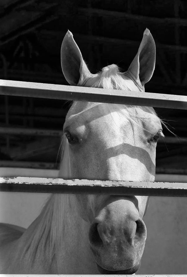 That horse is really keyed into you at this moment - definitely the right time to capture. I agree that you must keep the ears - they're an important part of the story and the look. There are a few things you can do to help this image along: straighten along the bottom bar; remove the top bar; darken the bars that cross over the horse (too difficult to remove; brighten its eyes; remove tiny distractions like the fly in the lower right; crop a bit. Here's my rendition showing those edits: