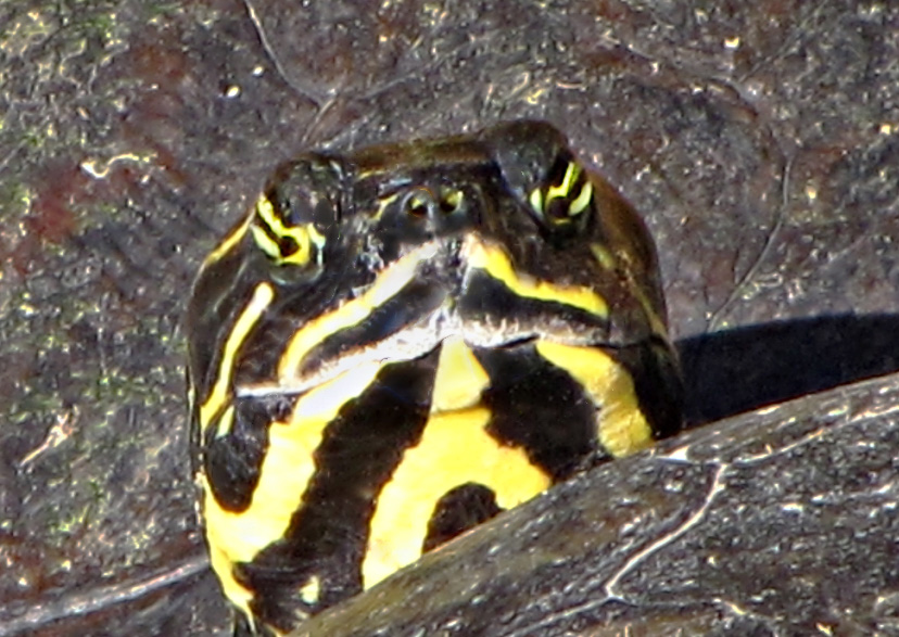 This turtle is very much blending into its shell and the shell of the 2nd turtle. Also, the sunlight (or your flash) caused some over-exposing of its face.