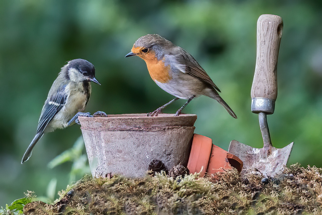 This is an amazing tableau, with the birds in apparent conversation as Rusty said. The birds, pot & trowel pop nicely from the background which is a nice bokeh.