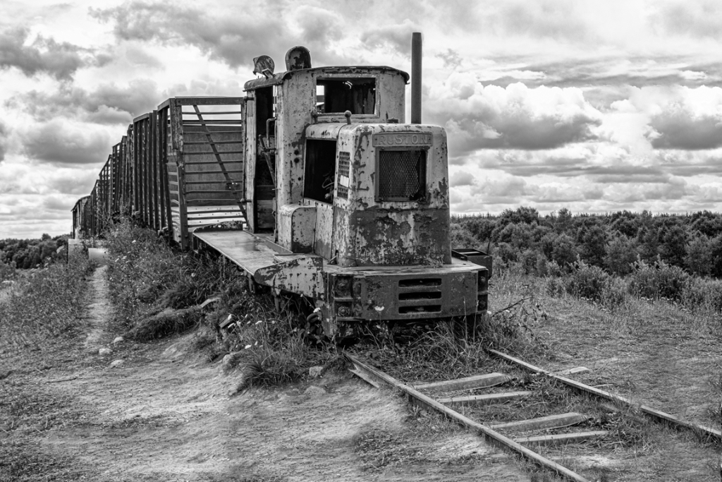 I think monochrome is a great choice for this image. There is plenty of tonal range and the sky adds a moody feel to this derelict train.