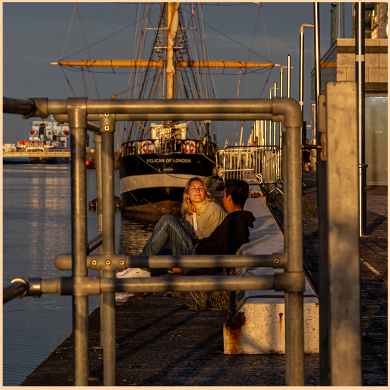 I did crop a bit, but kept to the orientation you chose, lightening the right side and the shop in the distance, dodging the couple a bit, and adding a stroke around the outside to emphasize the squares. Thoughts? |