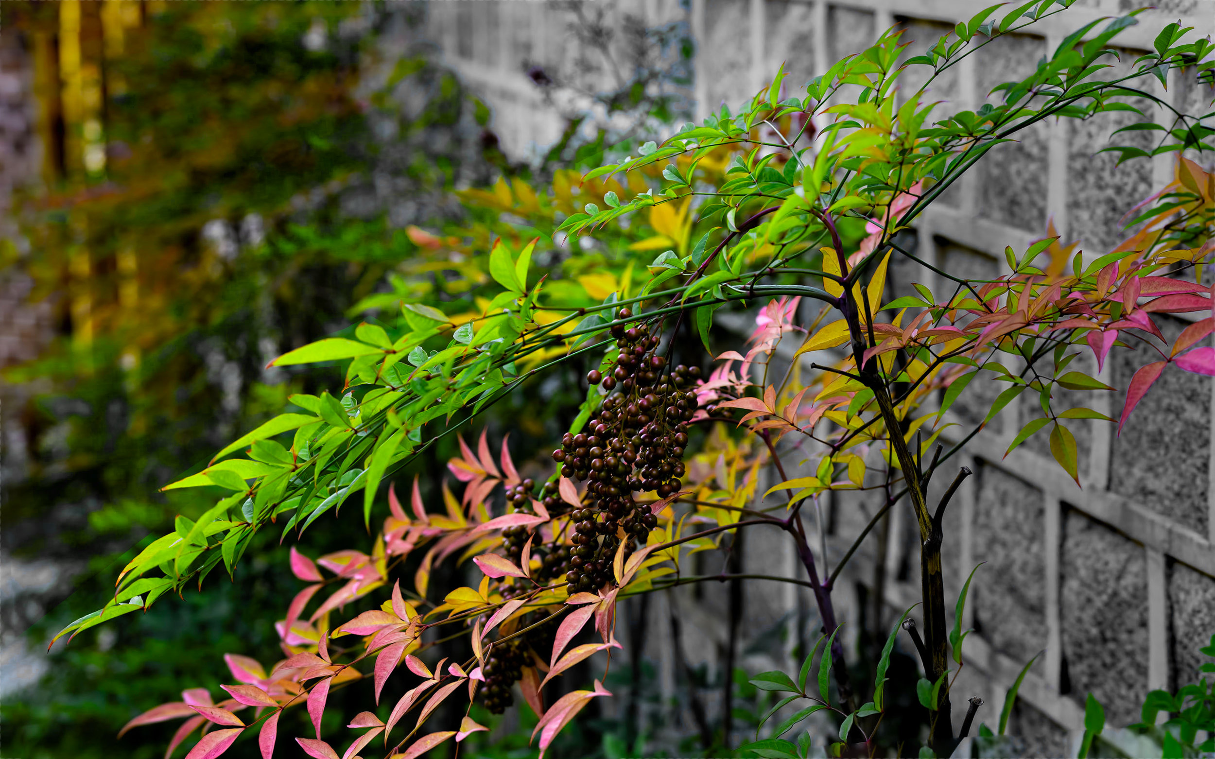 I straightened the image, using the wall as a guide. Then I desaturated the wall and darkened the greenery in the background. Thoughts? |