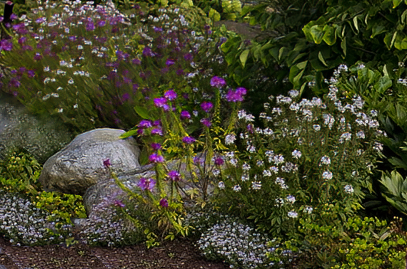 I rotated it slightly to straighten the orientation of the flowers, then cloned out the stone path. Thoughts? |