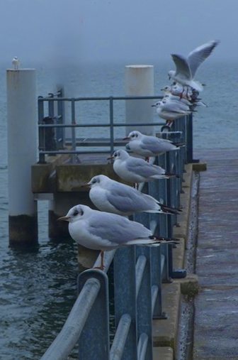 Cool capture. I found the orange and red signs to be a distraction from the birds. Here's an idea of what it would look like without them. Thoughts? |