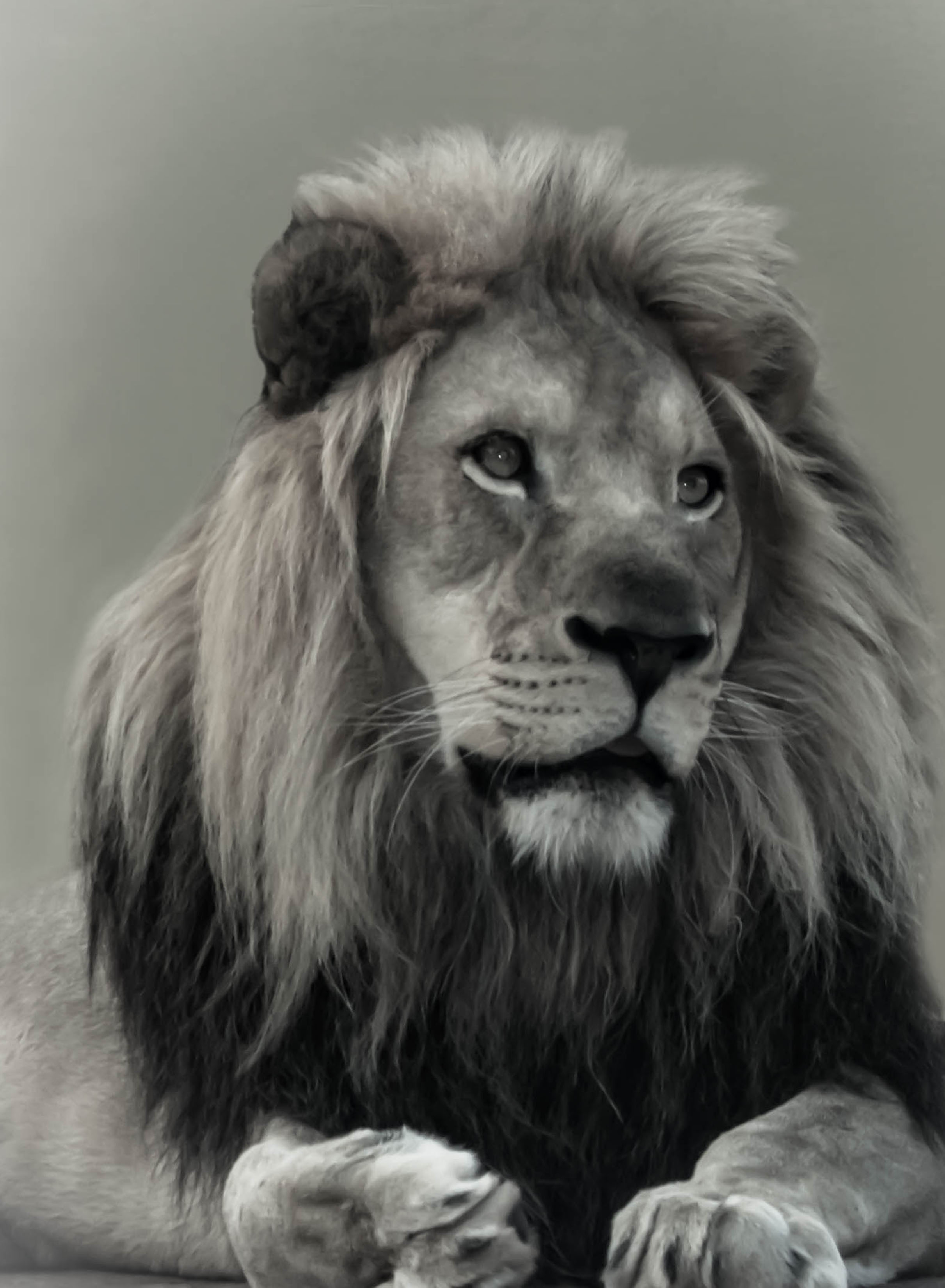 Piers - in my humble opinion, this is one of the best lion shots I have ever seen. The expression, and especially the eyes, come across extremely powerful - his dark lower mane accentuates his face and makes it stand out. This guy comes across as true royalty. I like the way you went with the background, and as mentioned, you might want to work on the masking around the mane - I'm thinking a judge might find fault with it as done. Monochrome is to me certainly the most effective presentation. What does bother me is that he appears to be on a concrete floor. Kings don't lie on concrete. I download the image and tried to crop him tighter, but ended up cutting off his paws - not good. Maybe someone has a better idea. Still a fantastic shot. |