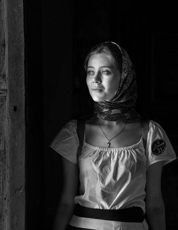 Nice one Israel. I like your subject and the way she was posed. Elbows tucked in close to her sides, body facing forward and head slightly turned… makes for a real interesting and attractive pose in my estimation. I would not have guessed that she was in any sort of temple, although she does have a covered head and a cross. I don't delve too much into portraits, but when I do I like to get at or slightly below my subject's eye level (which you did) and move in relatively close. In this kind of image I want my audience to home in on that radiant face and not drop attention to hands, dresses or any other objects. I downloaded your original, cropped tighter, went to a black and white image and did some slight light adjusting. Your take was perfectly fine and I don't claim to have improved it. I just hope to give you a few additional thoughts of bringing out the charm. |