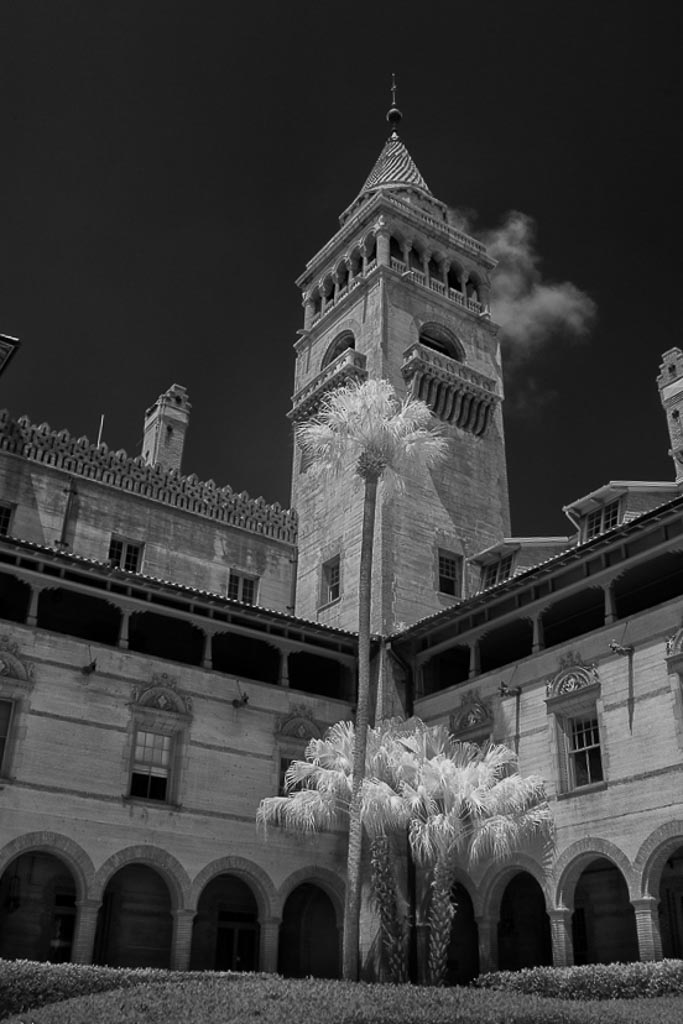 The Infared turned the dark green palm fronds a nice bright white but the tall one almost gets lost in front of the strongly lit tower. In Lightroom I adjusted the upright perspective, added a graduated filter to darken the bright foreground, reduced the highlights on the building and opened up the shadows under the arches to bring out more contrast. |