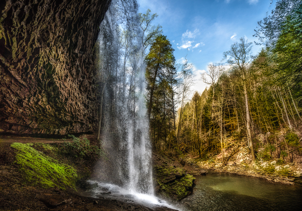 I think I prefer not loosing any of the top of the waterfall; I like the lacy effect of your shutter on the water falling. To straighten the trees on the right I tried Perspective Warp in Photoshop. The edge of the selection needs blending, but you get the idea. I'm new to Photoshop.... |