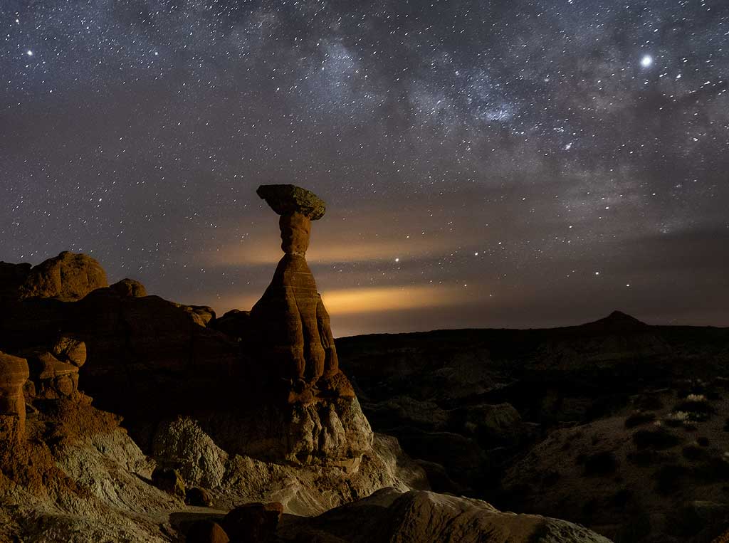 Well lit foreground, well placed subject against the backdrop of the milky way sky all together makes a strong composition.
