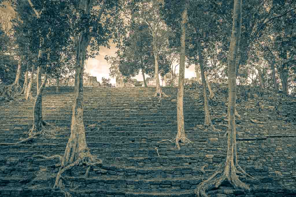 This duotone image evokes a time gone by long long ago. Composed of an ancient staircase with those unique trees rooting their way between the bricks to hold on compels the viewer to see them as marching up the stairs. Unusual subject with nicely separated trees.