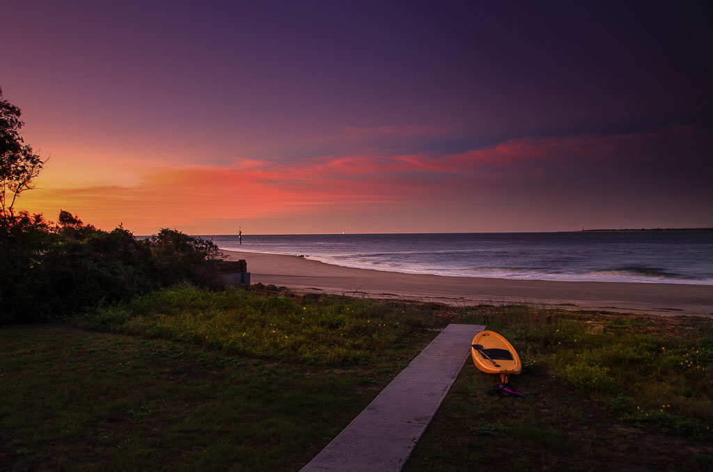 I like the diminishing perspective of the walkway leading to the beach, which I lightened a bit, as I want to encourage exploration around the bend in the beach to the left. I used a graduated filter top and bottom to increase a sense of depth & sunrise color, and pulled more color from the yellow flowers. A slight crop from the bottom to strengthen the triangular shape of the lawn, and a bit off the top as it didn't add much value and I wanted the horizon off center. |
