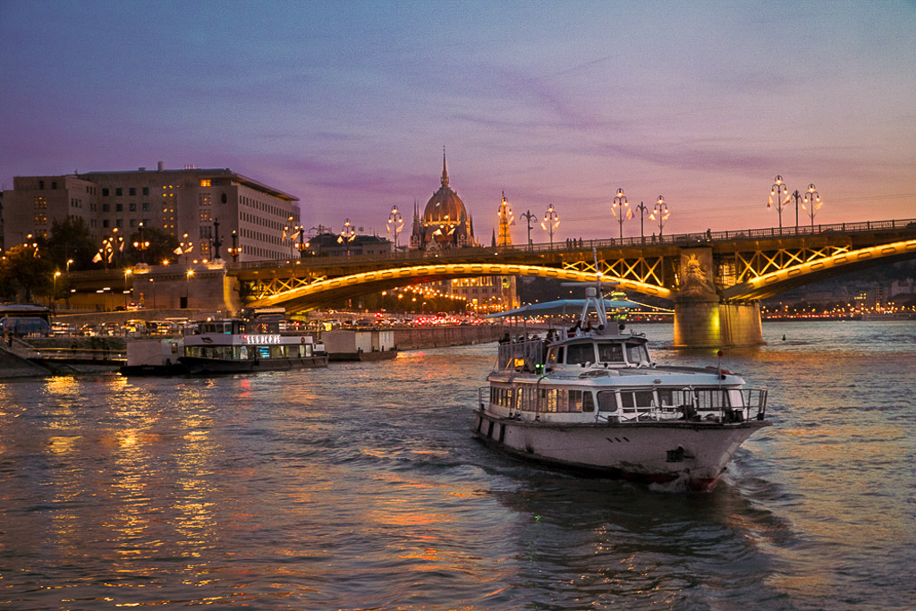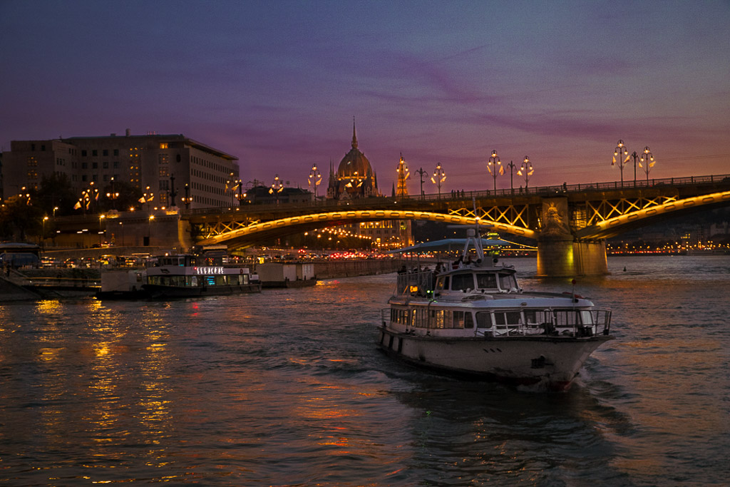 Good choice using the cruise boat as your foreground supporting element and timing the shutter to catch it just under the arch of the bridge and not merging with it. I enjoy the wonderful city streetlights, the way the bridge is lit, and the colorful water reflections.