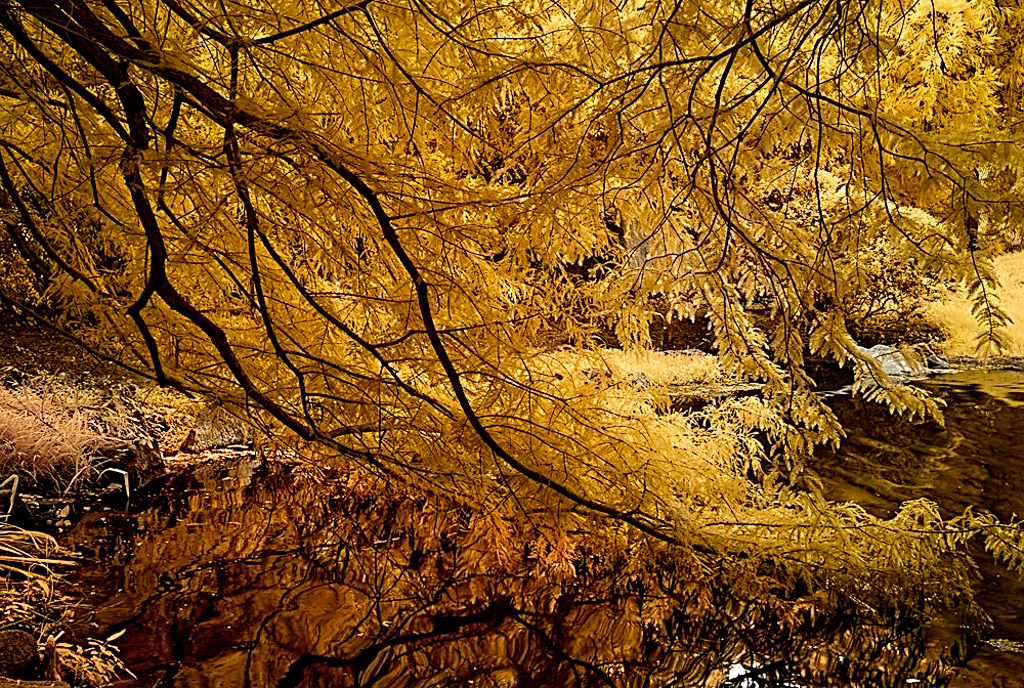 I like the strong diagonals and the contrast of the branches against the golden leaves. I feel there's more detail in the water underneath. It creates a peaceful mood. |