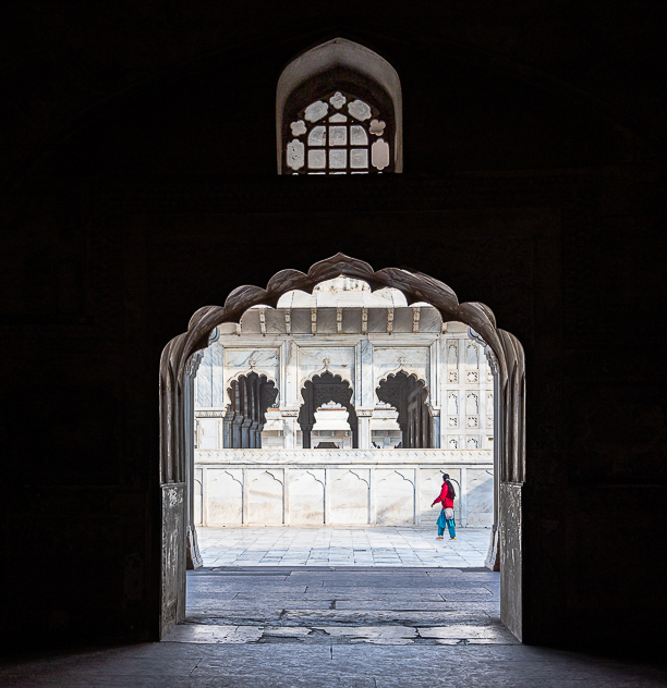 The neutral tones of the complex architectural details juxtaposed with the colorful human form brings a pop of contrast, color, and gesture and absolutely makes the image for me. To bring that subject closer, I cropped some of the foreground. Perhaps consider flipping photo horizontally so it reads left to right.
