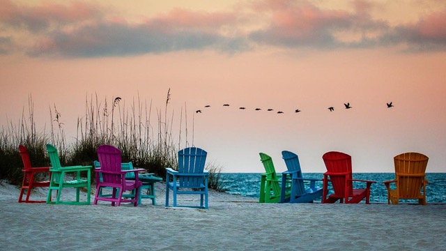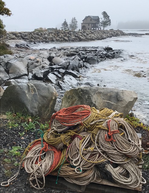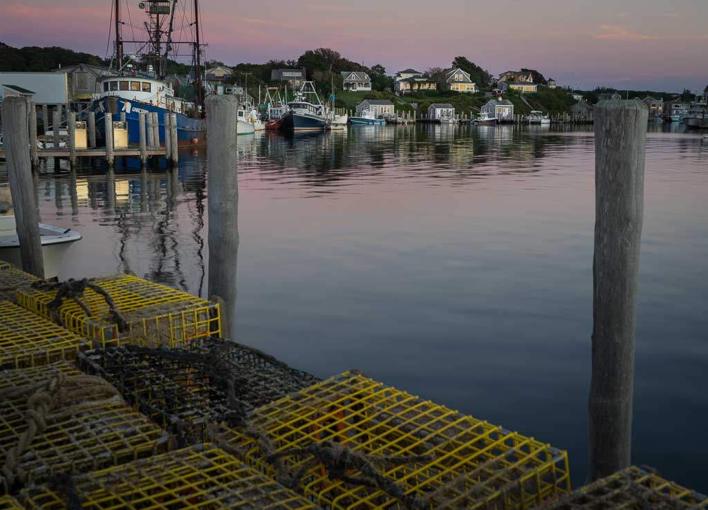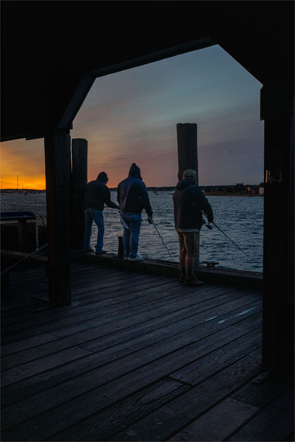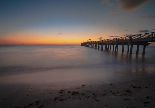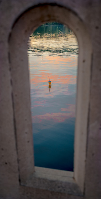 I see this as a graphical landscape image dominated by horizontal blocks. My eye is first drawn to the strong graphical horizontal elements and the red basket, then the other pier supports and finally the vertical pilings beyond that just touch the horizon. Pleasing color palette and calm seas and sky.