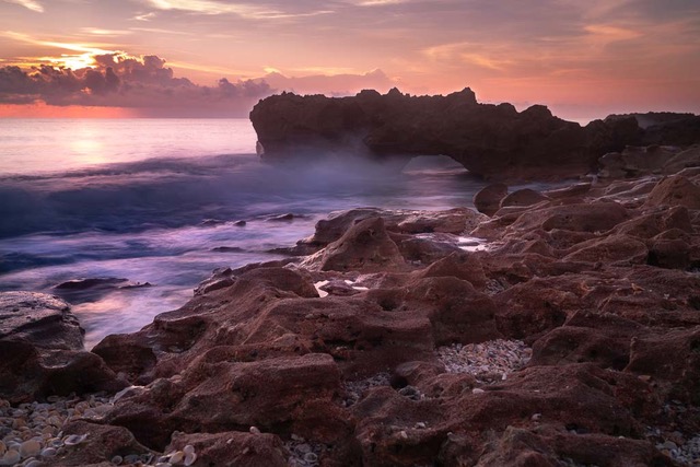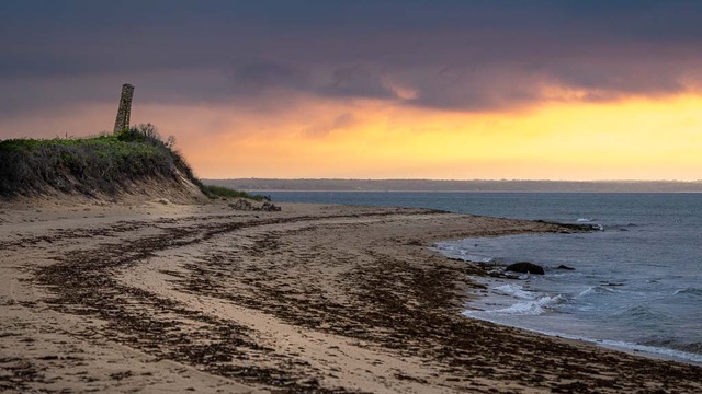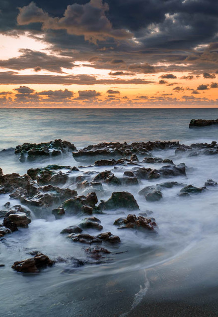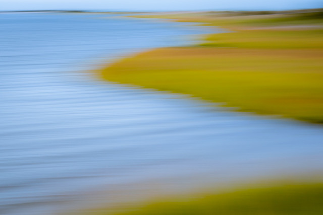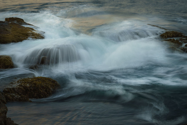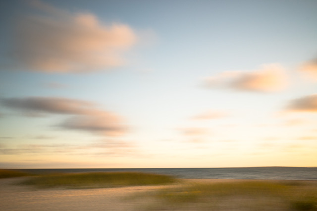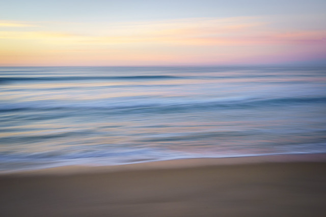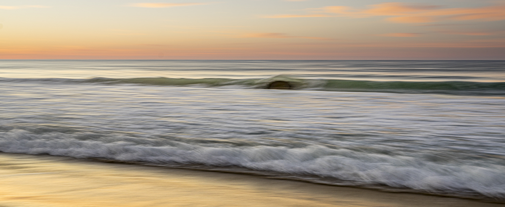 I took this image with camera on tripod. After some long exposure images, I then loosened the mount slightly and moved the camera in line with the wave flow; sort of a diagonal downward left to right motion. I used various exposure times and chose this one for the show of motion in the shore break wave as well as the wet golden sheen on the beach. |