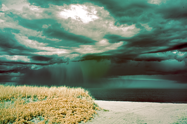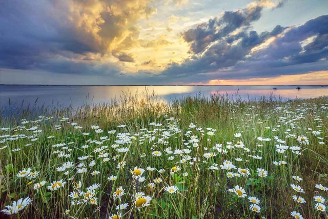 Magnificent grand landscape with an atmospheric mysterious dark and brooding mood. Gives me the viewer a sense of place, of being there, a part of the scene. Areas of dark detail that emerge in the shadows of the clouds and grasses enhance it. The illumination within the clouds juxtaposed beyond the flowers reinforces the mood and is the compositional hook for me. The dramatic color palette enhances the scene. Hope you print it! |