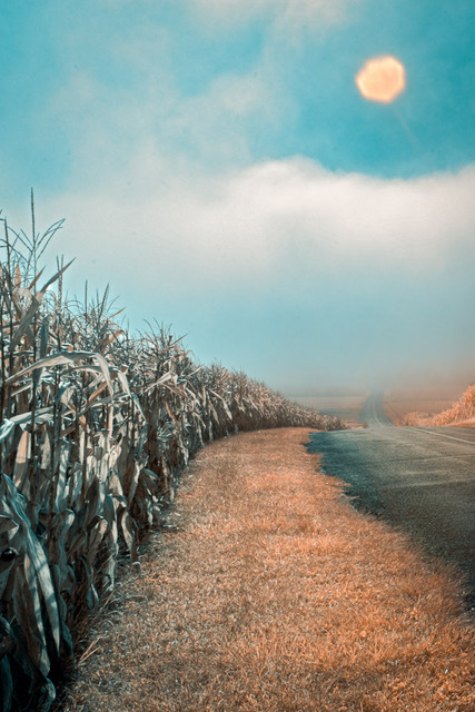 Another view here. I feel the inclusion of the road helps provide a sense of place, an establishing shot that leaves me with more of a sense of pulling off the road for safety due to fog. To me the lines provide added value to the image of wonderful atmosphere and mood. Shot from a nice perspective using leading line, diminishing perspective and the muted colors of fall to good use. |