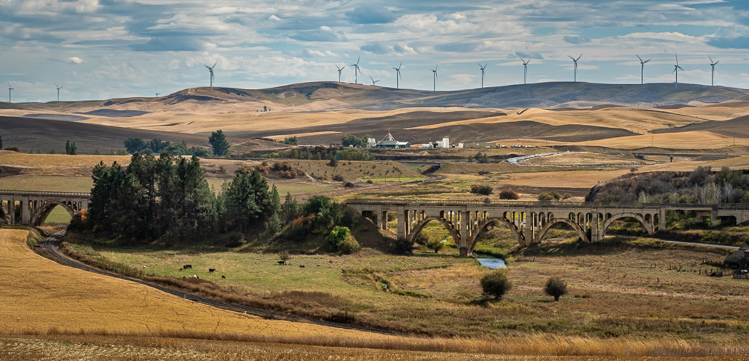 Wonderful curved leading line of rail road tracks brings you into the image and under the ancient elevated multi-arch bridge, the undulating hills of various colors, textures, tones beyond and hence on to the ridge top with a long line of state of the art windmills punctuating the sky from edge to edge.