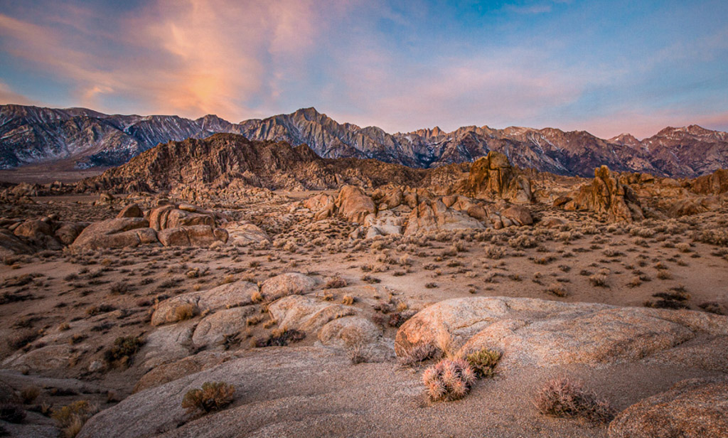 In LR I put a radial filter on the cactus, brightened it and warmed the temp more yellow and magenta as well, added contrast too. Cropped up from bottom to keep eye on the cactus. Then another inverse radial surrounding the cactus to darken all the remaining landscape a tad and keep the light on the cactus. Took a brush to the mountains with dehaze and contrast to bring out more detail. Finally a brush to subtlety brighten area between cactus and bright sunrise glow to help connect them visually. |
