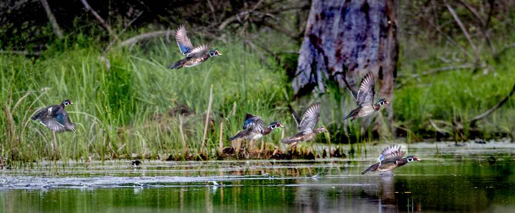 Interesting image that tells a story. I like the idea and capture of the takeoff. That big tree in the center is no doubt distracting.I played with the History Brush tool in PSCC to Color Darken the big tree and Color Dodge the birds. No other retouching. Just food for thought. Thanks for sharing. |