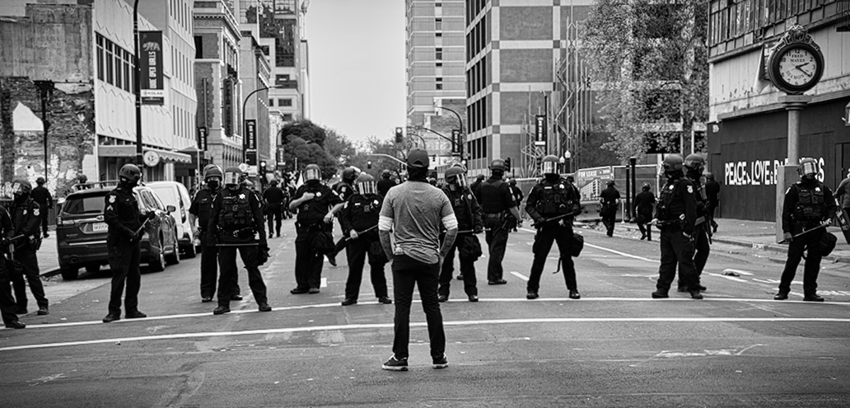 Turned it into a Black and White and opened up the exposure to combat the very light sky and bring focus into the line of police. I purposly left the clock in as it adds interest in my view. I feel black and white is a better choice for street photography.