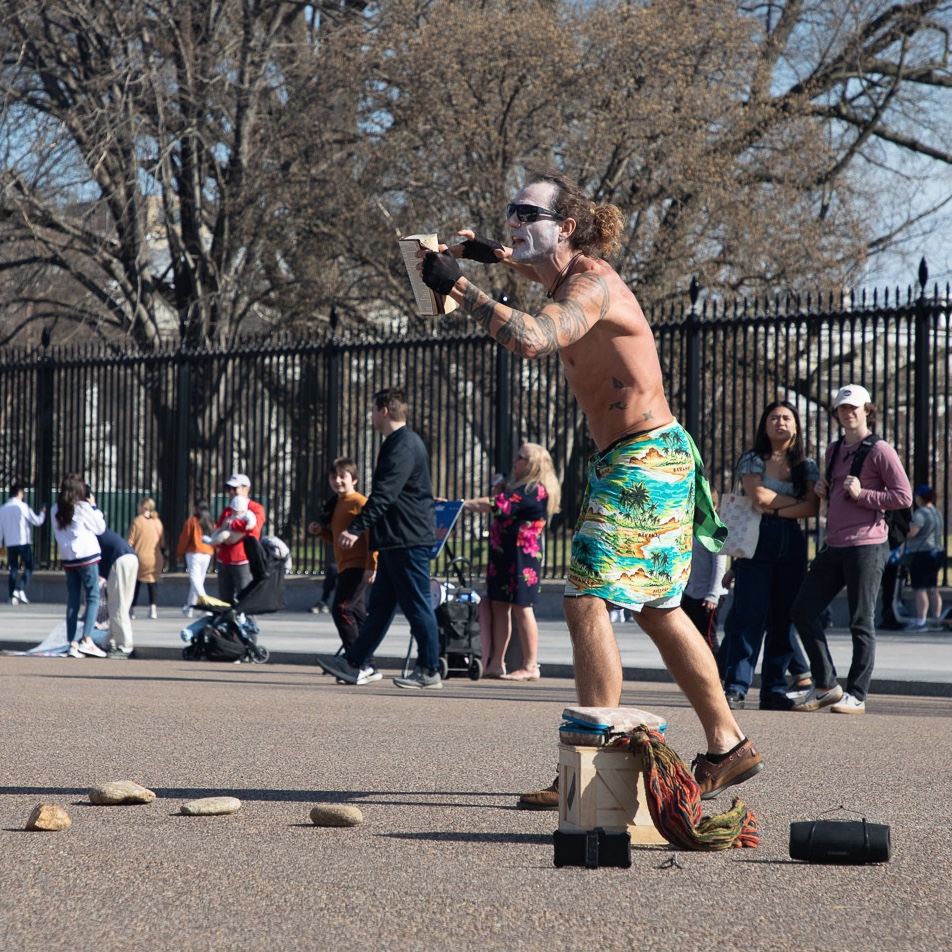 Submitting my version cropped to square and making the clown stand out a little more. The blonde lady preaching is prettty lost in the background. What catches my eye is the video camera on a tripod. The guy is making a video of himself. Good work getting that camera in the picture. Sorry to crop it out. Choices, choices. |