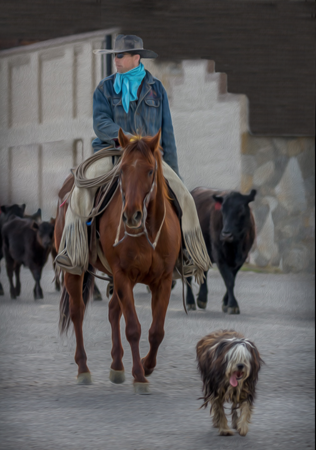 There's a lot to like about this picture Kaylyn. One of the features that add to this composition is the dog up front leading the way and the casual look of the rider. I tend to notice first in any image where the bright parts are, and in this case I think the background to the rider's left is distracting. I hope you don't mind if I did a little quick work to tone down the back and brightening the face of the cowboy, centering the focus of the composition on him, where it should be. This is a rough job, just a suggestion of things that can be done. |
