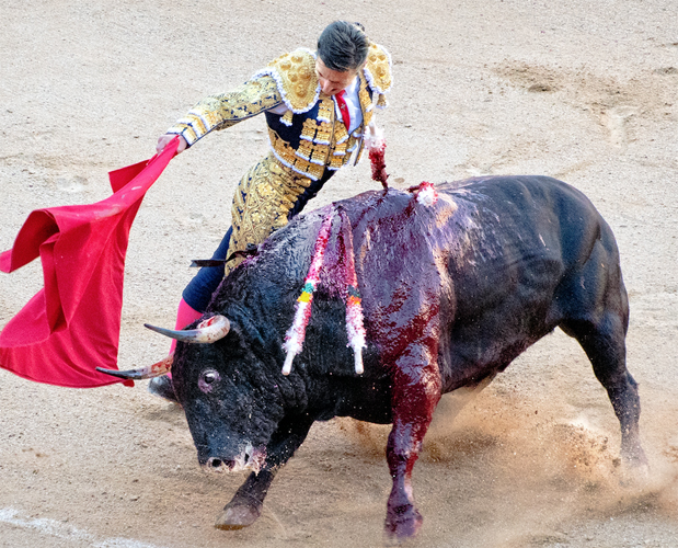As it turns out, if anything is right on, it's the reds. The stockings and capes are, in real life very saturated, almost a dark hot pink, if there is such a color. The blood on the bull is actually quite dark, partly because it has started to dry, and also the color of the bull cutting back on the brightness. In no case do I remember seeing a bright red -- maybe in sunshine or on a white bull. And of course, it was getting dark already. |