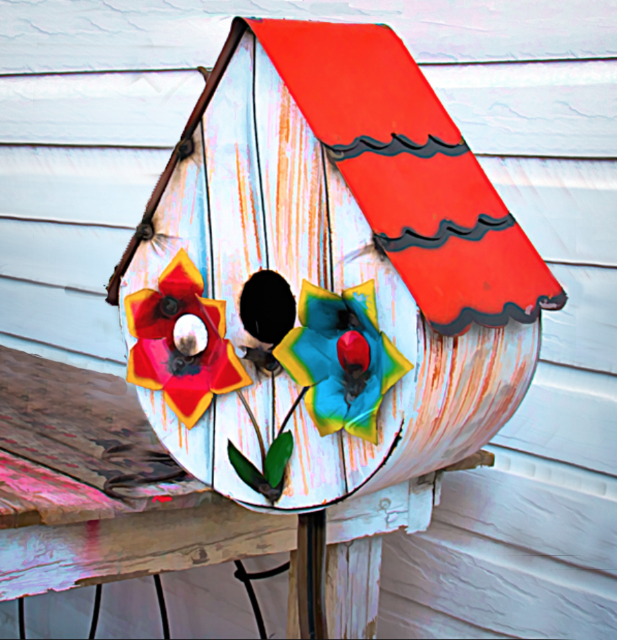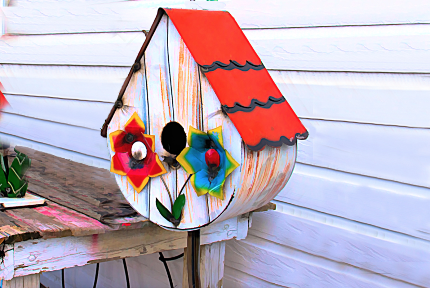 I hope everybody doesn't mind my going well off the deep end here, but I agree that the flowers do take away from the subject, and I thought I would take a different approach in eliminating them while at the same time making the bird house seem to be still within a more natural background. I extended the right side of the image to give me a source for cloning to the left side of the house, and then did a rough (very) job of making it appear that the (empty) table was still in the picture. Finally, I re-cropped the image. |
