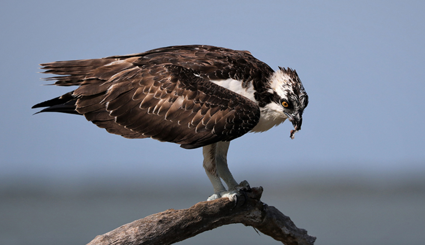 Well done capture, with perfect bokeh. The horizon line and the tree branch give the bird a good sense of placement. However, I think maybe there is too much shown of the surrounding elements in the composition, so I hope you don't mind if I played around with your picture to crop in so that the subject is more prominent and detailed. I also brightened the eye and added a catch light. Always a matter of personal taste, of course. The branch is still present, just not as much, so the osprey still has a solid footing. |