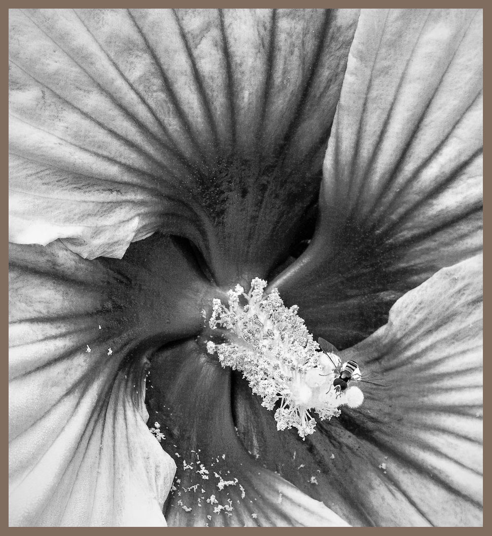 subject just in the right spot to complete this image. This may also work as a Black and White image (grey border added to bring the eyes back into the middle). I also used Adobe Camera Raw to increase the exposure and shadows for the bee and increased highlights around the outer edges. |