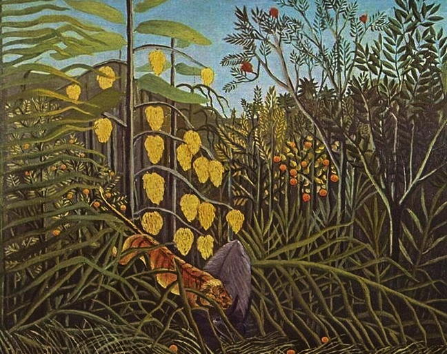 Interesting. I don't know why but it looks like a painting of Henri Rousseau (attached). Can you publish it in color? |
