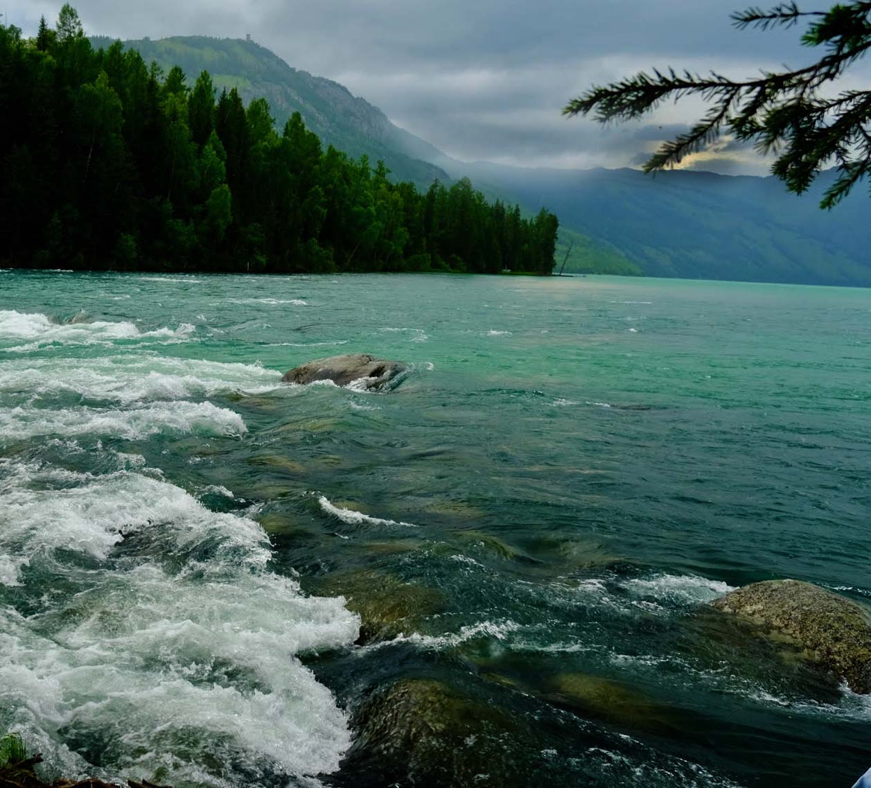 The image is a good starting point, as is. To me the rocks are the story. I felt there was too much white water with no foreground element. So, I got rid of the small stick, cropped out the left side, cloned and burned in the hot part of the sky, tweaked the brightness and contrast. So, now that I have ruined your picture, here's what not to do.