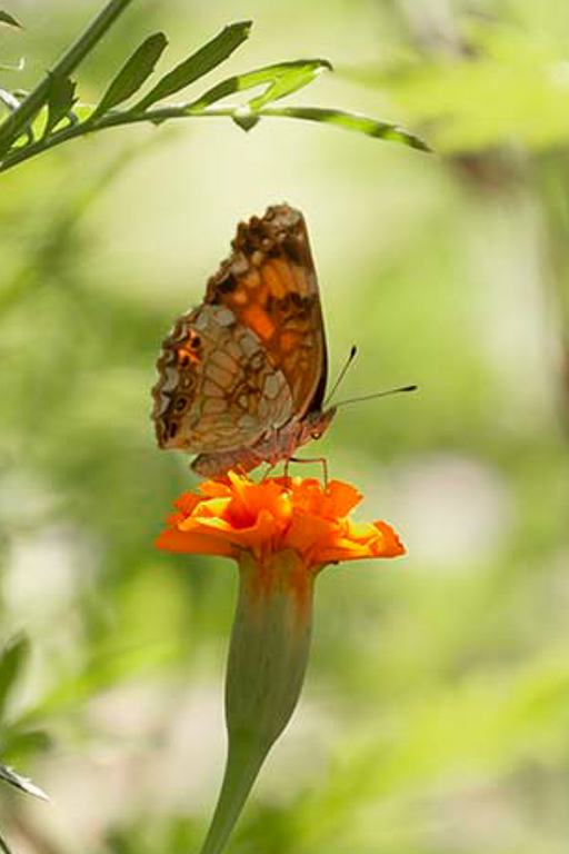 Lisa, my eyes are dancing happily around the bright orange spots in the flower and insect wing. The wing glows as if on fire. The background color complements the orange well, and the background bokeh is excellent. I would try additional darkening of the white blobs, particularly the large one to the right of the flower. The tight crop has removed several features in the original that I like: the curve and orange streaks of the flower calyx, and the curved leaf above the flower that frames it. Opening the crop preserved these features, but resulted in a distracting background. |