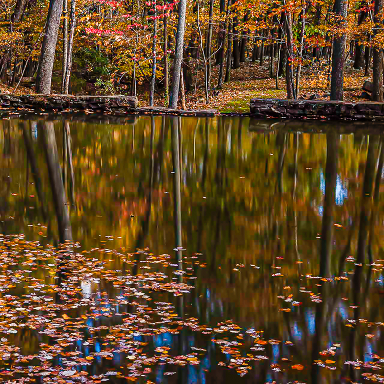 In looking at your image I sense a magical quality in this place. The original displays faint blue streaks that add much to to the affect. Most of these these streaks are lost in your crop. I tried a square crop that retained them. My eyes are now swept upwards, into the gap in the wall on the bank, and on into the leaf-strewn path. See what you think. |
