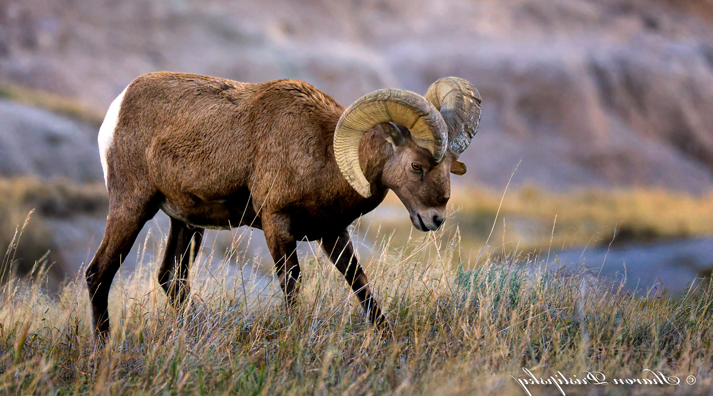 What a beautiful animal. Those horns are spectacular. Great catch!! In PS I tried a horizontal flip, a crop, and a darkening of the background to give even more emphasis to that magnificent animal. |