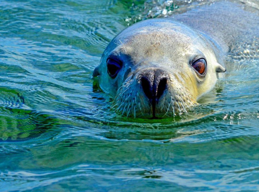 The seal is dead center, which does work, but I've cropped him a little differently to put him more on the rule of thirds and kept more of the teal water and removed his gray body and out of focus water on this back. Not sure its an improvement, but just a thought. |