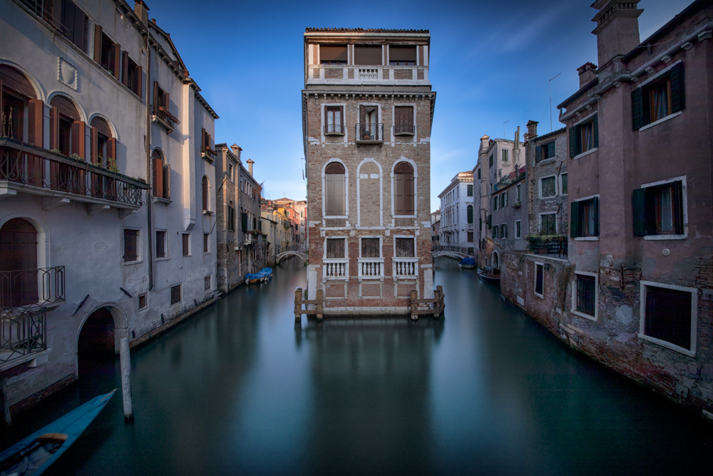 I actually photographed around sunset, so the light kept dropping with each exposure. The first was six minutes and this one was two minutes. I used ND filters to give me the smooth water, as its choppy and there are a million little boats zooming up and down these waterways, so its really ugly without the smooth water.