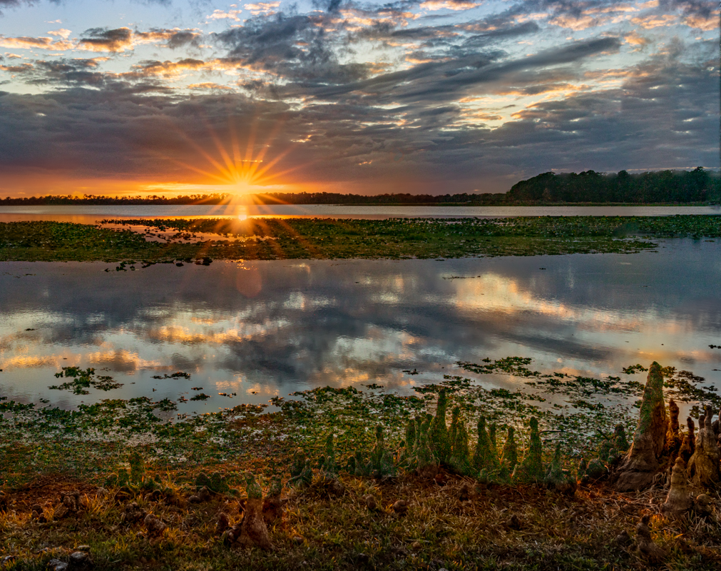 Oh, lots of great feedback! I've cropped and put the horizon and sun on the Thirds. I've darkened the blown out parts of the sun--too much? I've lightened the cypress knees--believable? I also used my adjustment brush in Lightroom to hopefully tone down the "crunchiness"--I removed sharpness, reduced clarity and texture off of much of it. Does that make it look soft in some areas? I painted in a vignette on the left side, since I had cropped away my vignette on the left. Additional thoughts? |