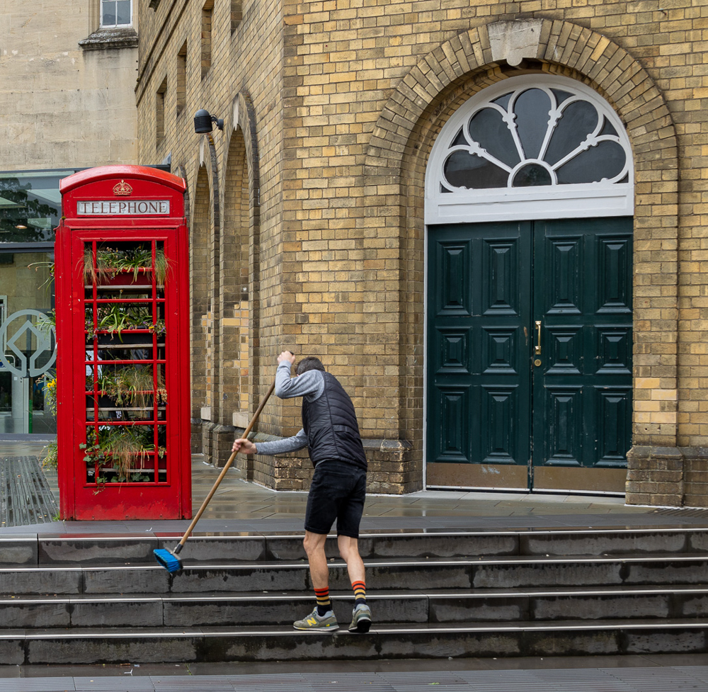 We have a lot of interest going on with the phone booth and the sweeper and the old door. What about a crop to remove the step lines and the top left blown out sky? Or drop in a sky? Here's a quick crop.